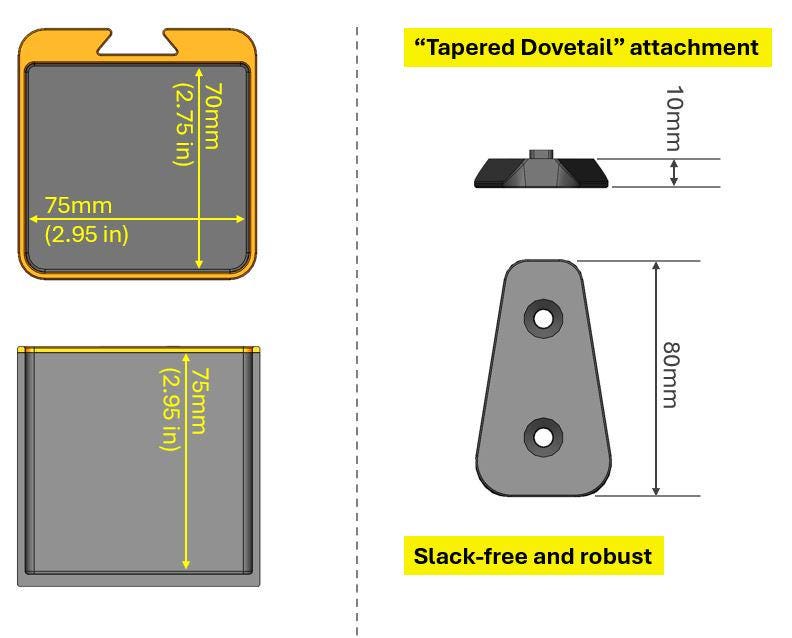 Upgrade your sim experience with our versatile extrusion rig mounted cup holder / storage container! Featuring our robust and slack free 'tapered-dovetail' quick-disconnect; the container can be easily relocated or removed to suit your needs. Each order comes with one dovetail mount of your choice, extra dovetail mounts (docking receptacles) are available. Includes all necessary hardware (bolts and T-nuts) compatible with 40 series or 15 series extrusion. For horizontally oriented extrusions, at least 2 slots are required for mounting (see photo). For 40 Series extrusion (40mm), the hole-spacing will be 40mm. For 15 series extrusion (1.5 inches), the hole spacing will be 1.5 inch.